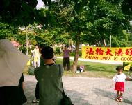 一天下午她们在炼功时,一位四、五十岁左右的女士一直在旁看他们炼功,等他们炼完后,便问:「你们是在炼法轮功吗?」不待回答,又接着问:「你们在这公开场所炼,难道不怕被抓吗?」这位学员听了,发现她受到大陆媒体造谣欺骗,对法轮功有很深的误解,马上拿出法轮大法简介及真象资料给她看并告诉她,台湾炼法轮功是公开合法的,全世界有六十几个国家的人们都可以自由学炼,唯独在大陆受到打压,这是江氏集团因一己之私,利用权力动用国家机器,利用官方媒体电视、报纸、杂志、军警公安系统铺天盖地的造谣并镇压法轮功,并以非常不人道的手段迫害法轮功学员,目前在大陆已有至少九百七十几名法轮功学员被迫害致死。而自己身在台湾,能自由合法的学炼法轮功,且学炼法轮功后,身心健康、家庭和乐,所以也带着小孩一起学炼。因为法轮功教导人要以「真、善、忍」的标准要求自己,提高自己的心性,世界上没有什么比教人要「真、善、忍」的法轮大法更珍贵的了。这位女士听完了之后有感而发的说:「以前我的朋友曾告诉我一些法轮功被迫害的真象,原来他说的都是真的啊!」