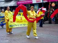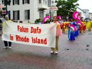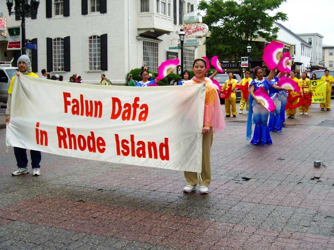 【明慧网2004年6月8日】2004年6月6日,罗德岛州学员以及麻州和康州的部分学员应邀参加了普罗维登市老兵节游行。学员们在“法轮大法好”的音乐中表演着扇子舞、红绸舞,迎来了观众的阵阵掌声。毛毛细雨中,学员们向人们展示了大法的美好、祥和。