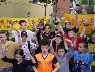 街市期间,主要街道禁止车辆通行,商家在街道中间搭起了售货摊。组织者得知法轮功是免费教授的,不涉及钱财后,很高兴的指定给我们一个很热闹的地段,这样很多来来往往的行人能够看到我们祥和的功法表演,并接受我们的免费资料。行人中有很多儿童,他们被功法深深的吸引住,想要学着炼动作。他们有的忍不住呵呵的笑,有的则能闭着眼睛保持入静的状态。