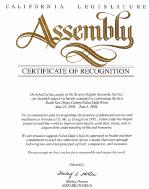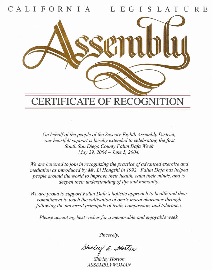 谨代表第78选区的居民,我们向2004年5月29日至6月5日首届南圣地亚哥郡法轮大法周的庆祝活动表达衷心的支持。