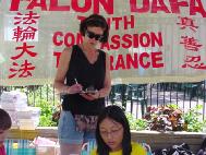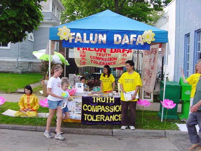 一位两岁的小女孩在法轮功的展位前停留了很久,不断的模仿炼功的动作,最后索性也要在学员演示功法的垫子上表演了起来。她的妈妈看到女儿的天真可爱乐得合不拢嘴。另外一位8、9岁的女孩向一位小弟子学习手工制作荷花,并说要回家后教她的妈妈。有个小男孩儿索要了资料并表示希望自己的妈妈能学习炼功。还有几个小伙子,试着要双盘,虽然没有成功,但他们还是坚持要学第五套功法,十分认真。几个小女孩了解到李祥春的遭遇后认真的签上了自己的名字。