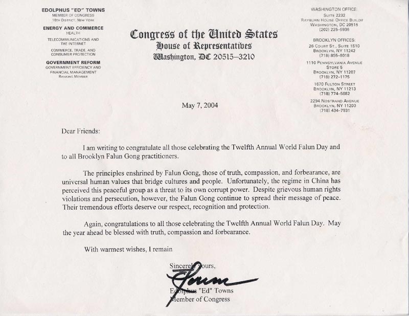 【明慧网2004年6月9日】美国国会议员爱德-唐斯(Edolphus "Ed" Towns)5月7日写信给纽约的法轮功学员,向所有庆祝法轮大法日洪传12周年的人们及布鲁克林全体法轮功学员表示祝贺。