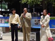 2004年6月30日中午,加州圣地亚哥市的法轮功学员在圣地亚哥市政府广场举行新闻发布会,揭露江氏集团海外雇凶杀人的恐怖主义行为。