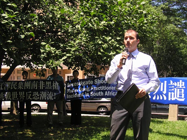 【明慧网2004年7月1日】(明慧记者王瑞林华府报道)惊闻6月28日发生在南非的曾庆红雇凶杀人、枪击澳洲法轮功学员事件,华府法轮功学员于2004年6月29日在中国驻美大使馆前举行新闻发布会,强烈谴责江氏集团的恐怖主义行径。