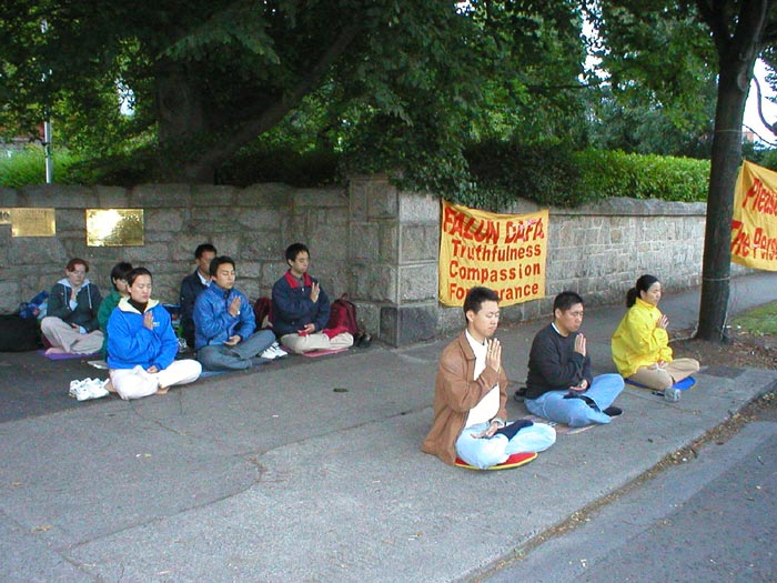 2004年6月26日世界反酷刑日,英国法轮功学员在伦敦中国驻英大使馆前举行了和平请愿活动。无独有偶,今年的奥运火炬的传递正好在这一天经过伦敦中国城,一部分学员利用这个好机会,到中国城将中国法轮功学员受到酷刑折磨的真象传单发放给那里的人们。