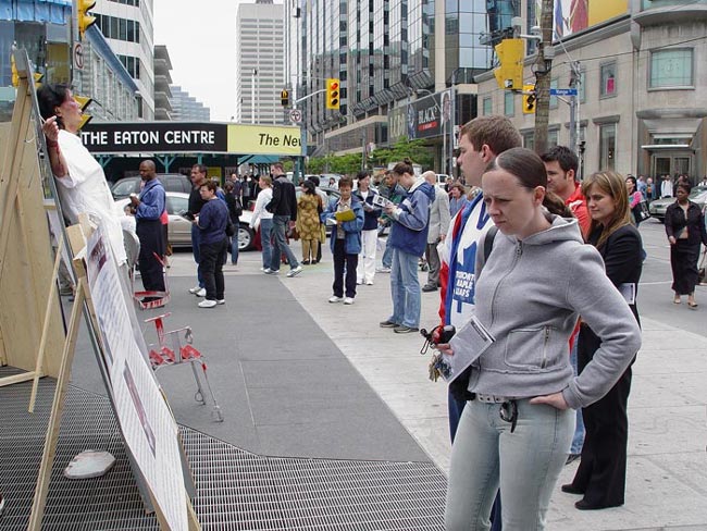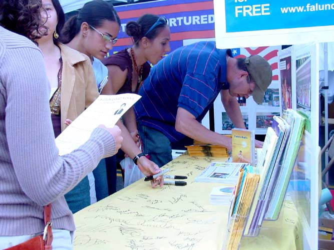2004年6月26日是联合国支持酷刑受害者日,瑞士法轮功学员在工业重镇巴塞尔市中心举行迫害法轮功图片展,许多行人为江氏集团的暴行而震惊,纷纷在呼吁书上签名。一些来自以色列的游客说要在他们那儿播放真象光盘,让更多的人知道。一位中国小姑娘以前自己学《转法轮》,炼功,但因为不是特别明白,后来也就放下了。今天遇到我们,她问了很多问题,觉得明白多了,她还帮助给路人发材料。