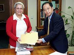 【明慧网2004年7月1日】中央社6月30日图片报道,法轮功学员在南非遭受枪击,加拿大法轮大法学会会长李迅 (右)和学员代表二十九日 (当地时间)下午到南非大使馆请愿,并递交请愿信函给南非政府,由大使所罗门女士接受。