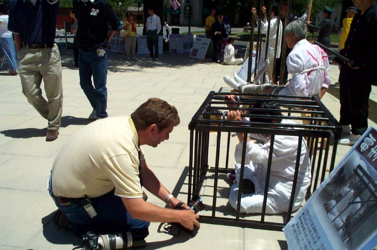 在凝重的音乐声中,学员们演示着被吊打、坐老虎凳、被插竹签、折磨性灌食、被强行堕胎、关铁笼子等,把千千万万中国大陆的法轮功学员受到的残酷迫害的现实,活生生的展示在人们的面前。还有部分学员在酷刑展旁演示功法。很多路人仔细的观看每一个酷刑和图解,有的表示这么好的功法,不应受到残酷的迫害。有的与学员交谈了解更多真象,