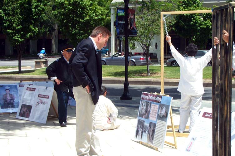 一位山景城的居民唐尼(Tony)表示,他开车经过这里,看到学员,所以特意停车前来观看。他说他曾到过中国,并不知道那里正发生着迫害。当学员告诉他,在中国有一千多名法轮功学员被证实被折磨致死,还有很多仍被关押在精神病院、劳教所等受到酷刑折磨,这里展示的只是冰山一角。他激动的说:“我相信这一切!这是恐怖主义行为。我能做些什么?”
