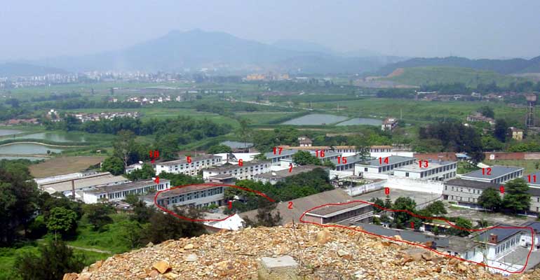 从图中可见六队已经荒芜,是因为从2、6队互换后,没多久整个大队的房屋全部粉碎,随时处于快倒塌的边缘,所以大队迁移到图中的2的原来一大队的厂房里住宿,而吃饭场地和食堂搬到图17的8的厂房内。
