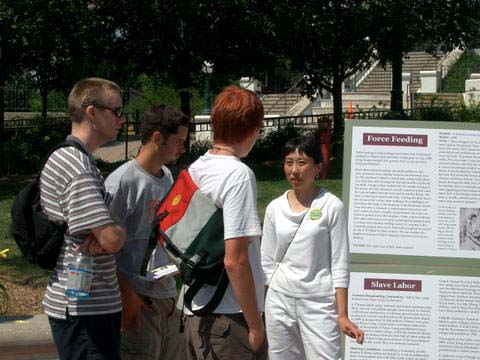在广场附近有一个卖热狗和冷饮的流动车,车主一边做生意一边向路人介绍酷刑展的内容和目地。了解了情况的路人又再向其他人介绍展览的内容和发生在中国的对法轮功的镇压。