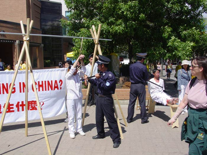 【明慧网二零零四年七月十二日】2004年7月9日中午,参加完刚刚结束的加拿大卡尔加里市牛仔节(Stampede)游行后,法轮功学员来到市中心的马克斯贝尔剧院(Max Bell Theater)门前,进行真人模拟酷刑展,向人们展示了法轮功学员仅仅因为不放弃自己的信仰,在中国大陆受摧残受迫害的情况。