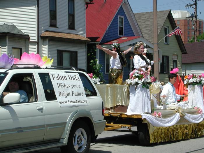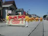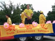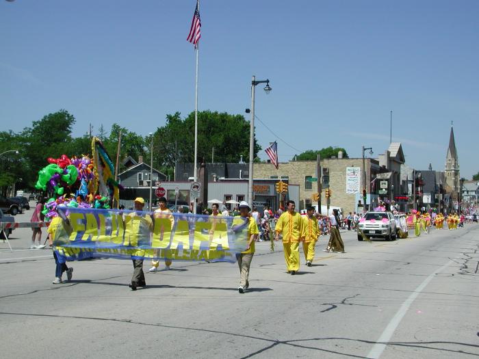 【明慧网2004年7月12日】2004年7月10日,法轮功学员参加了在威斯康星州密尔沃基市(Milwaukee)传统的南海滩欢庆游行(South Shore Water Parade), 今年是密尔沃基市市民第75次欢庆该节日,也是美中地区法轮功学员们第二次参加,在2003年首次参加该游行时,法轮功学员以良好的精神面貌和精心准备的花车获得了该年“最佳外观奖”(Best Appearing Unit)。