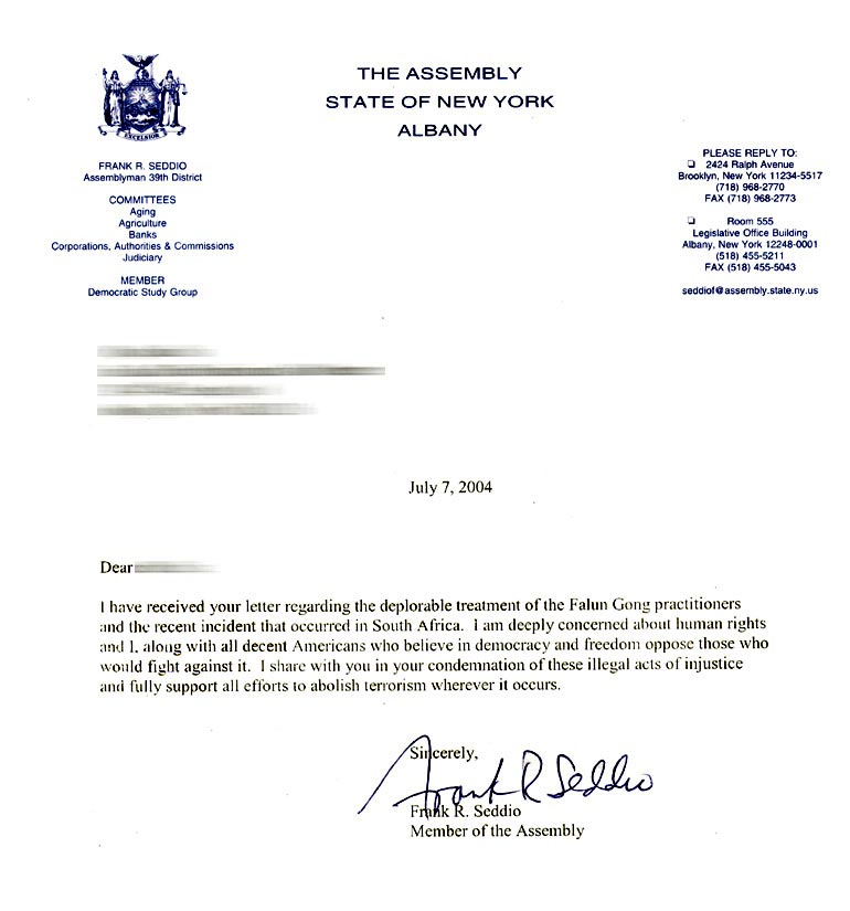 赛都议员在信中说,“我收到了寄来的讲述法轮功学员值得同情的遭遇和最近在南非发生的事件的资料。我深深的关注人权,和所有正派的相信民主和自由的美国人一起反对那些破坏民主和自由的人。我愿意和你们站在一起谴责这些非正义的不法行为并完全支持废除在任何地方发生的恐怖主义的所有努力。”