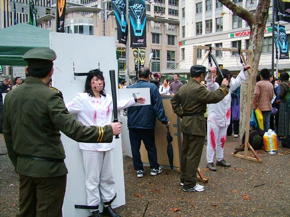 法轮功学员是和平理性的,面对无理的镇压与不公,他们心怀坦荡、真诚的告诉身边的人法轮功的真象,他们没有使用过暴力和极端的行为来抗争残酷的迫害。他们身处逆境,却并不麻木颓废,他们以坚韧的意志承受无名苦难,愈加坚定的用实际行动向世人展现着法轮大法的美好。到目前为止,经证实的已有1001名法轮功学员被迫害致死。绝大多数的学员死于残暴的酷刑折磨。为了更直接的让澳洲市民认清江氏集团迫害法轮功使用的邪恶手段,法轮功学员在Town Hall同时举行了酷刑展。