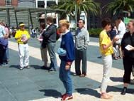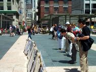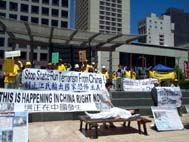王先生说,早在2000年10月,在中国城花园角广场就发生了江氏集团雇用的流氓打手攻击法轮功学员的事件。当天,近百位法轮功学员正在花园角广场和平的炼功、发真象资料,突然闯出十几名中领馆雇用的暴徒将学员发的资料撕碎,还围攻劝阻的学员,并将学员打伤。我是其中被攻击的一位。
