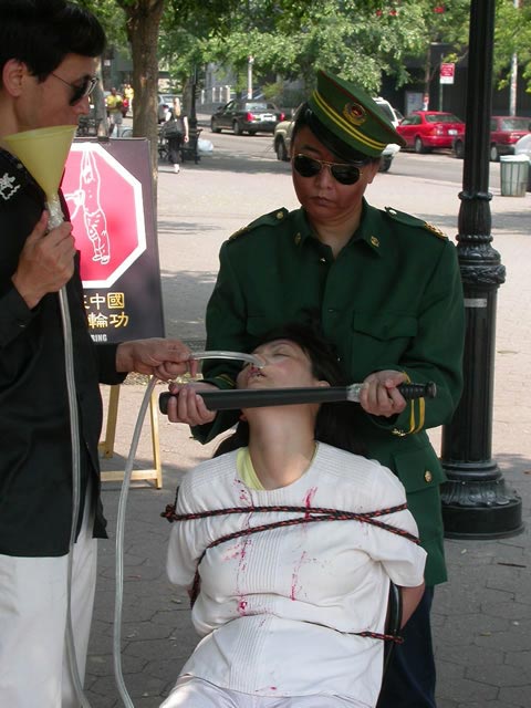 这中间最有趣的是那里跑来跑去的两位工作人员,听说法轮功学员来了,就跑来说,前几天看到你们的酷刑展览,很震撼,我们拿到CD,但不是教功带。在那里可以拿到教功录像带?