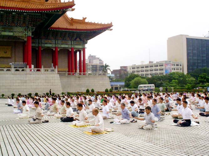 2004年6月12日清晨在台湾中正纪念堂前,拍摄法轮功学员大型集体炼功的画面。这确实是一个很好的洪法与讲清真象的机会,来了很多的同修。而另外空间的邪恶也真是害怕,制造了许多的干扰,例如在大家开始炼功时,突然下了一场大雨。
