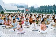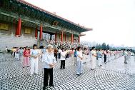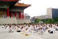2004年6月12日清晨在台湾中正纪念堂前,拍摄法轮功学员大型集体炼功的画面。这确实是一个很好的洪法与讲清真象的机会,来了很多的同修。而另外空间的邪恶也真是害怕,制造了许多的干扰,例如在大家开始炼功时,突然下了一场大雨。