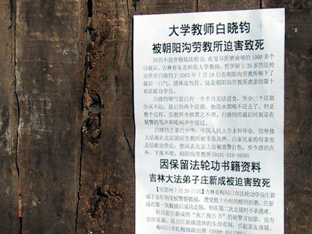 白晓钧,35岁,吉林省东北师范大学教师,哲学硕士。自从99年7.20后多次被拘,2000年7月因去北京上访被劳教1年,关押在吉林省长春市苇子沟劳教所,期间受种种酷刑折磨,被严重打伤,曾被送往公安医院。2002年1月在超期关押了7个月之后,因不放弃修炼,被强行送往长春市兴隆山洗脑基地,后被送往长春市朝阳沟劳教所关押,于2003年7月18日被迫害致死。