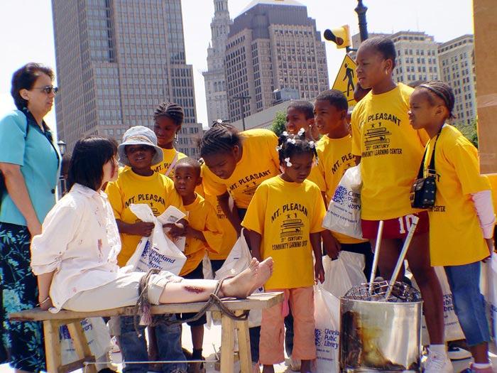 “迫害与真理”反酷刑展是法轮功学员带给这个历史名城发生在中国的残酷迫害法轮功的一个缩影。2004年7月8日和9日,这个展览在克里夫兰繁华喧嚣的公共广场和市政厅旁吸引了成千上万的参观者。