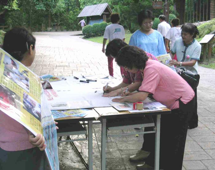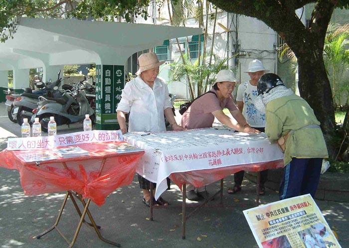 【明慧网2004年7月17日】台湾花莲法轮功学员于2004年7月15、16日于花莲美仑山公园、花莲市区、吉安黄昏市场、光复糖厂等地针对澳洲法轮功学员6月28日在南非遭枪击事件举办征签活动,呼吁世人认清中共江氏流氓集团的邪恶本质并拒绝其向海外输出国家恐怖主义。