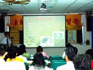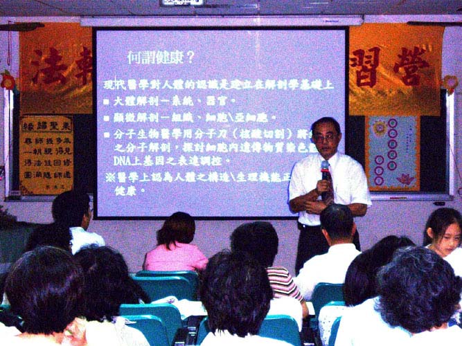下午课程由中兴大学学务长刘正义演讲,刘教授一开始便告诉大家,其实拥有自己的身与心灵的健康是可以做得到的,这在现代人有病就上医院的观念是很不一样的。因为刘教授有他专业的医学经验,指出很多医疗上的实际情况,都让大家感到惊讶不已,例如,若将人的风险分为3阶段,有低风险、中风险、高风险,则接受医疗确属于高风险之一,且现在的医学上的实际医疗效果竟然不到25%,并且自陷于“预防”的迷思之中,而科学并无法解决人类的疾病问题,这是有实际证据的说法,在场的人无不感到不可思议,教授指出这些专业知识是要证明若是自己透过心的改变,确实能够改变病的情况,当然课中教授更以具体的例子来说明,加上他自己的经验,博得了大家的认同。