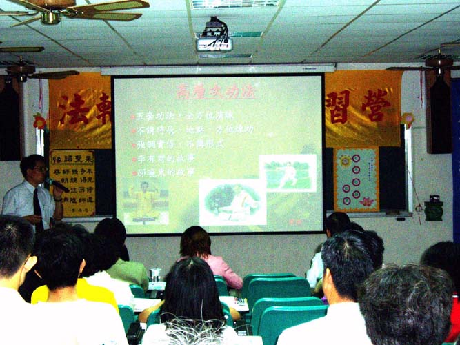 【明慧网2004年7月17日】2004年7月6日、7日两天,台中县梧栖镇举办“法轮大法教师研习营”,时间从早上8:30至下午5:00,共14小时的研习时数,课程内容安排了对法轮大法的认识、大法洪传功法介绍、真象影片欣赏、教功、以及修炼法轮大法的学者专家演讲、包括有硕士、医生、学级主管、教授等。在研习未正式展开之时,修炼大法的同修都已展现出为研习会负责的神情,笑容背后,可以让人感受到修炼者美好的态度。