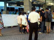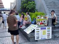 有一个年约五或六岁的小朋友和妈妈一起在等车,听学员向民众讲法轮功被迫害的真象后,也想签名,但是他不会写字,就去叫妈妈,连那么小的孩子都能明辨是非,伸张正义,江氏集团真是禽兽不如。有两个聋哑人士,一直在摊位停留很久,两人比手划脚讨论很久,虽然无法沟通,但他们在看完所有资料后就签下大名。