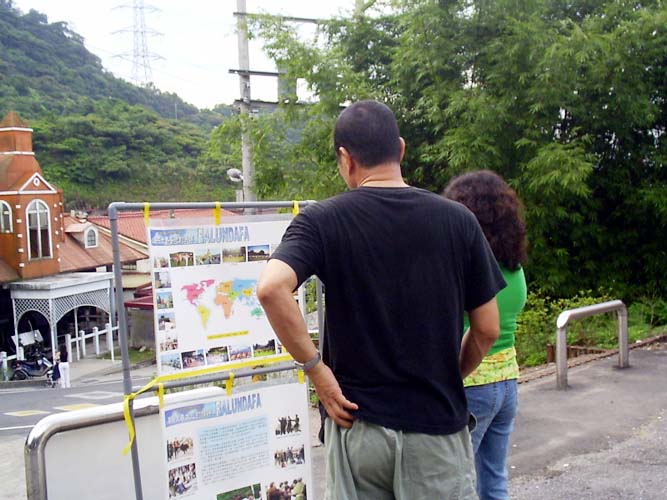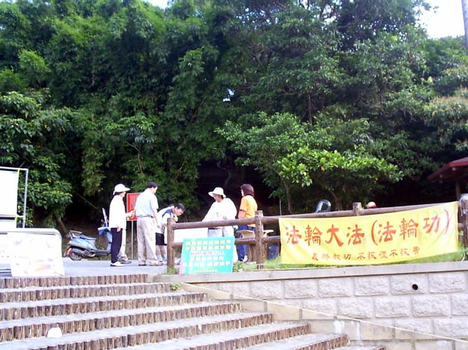 【明慧网2004年7月17日】为了声援二零零四年六月廿八日在南非遭枪击重伤的澳洲法轮功学员,并强烈谴责江氏集团把国家恐怖主义扩张到海外,请善良的人们共同制止江氏集团迫害法轮功的暴行,台湾基隆学员这一周来展开三场征签活动,两天在市区公车循环站下午4:30~7:00的下班时间征签,周六上午基隆郊区学员在著名的景点情人湖洪法炼功和征签,三日下来民众反应热烈,征集大量民众支持。