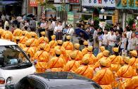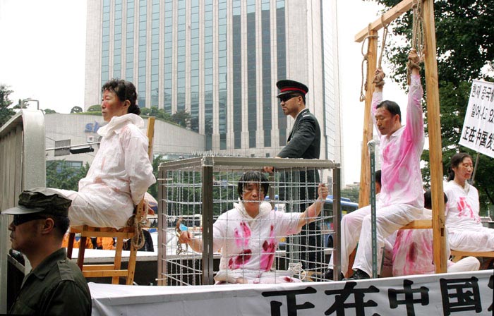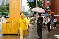 ![]() 真人酷刑演示 | ![]() 游行队伍中,学员们向世人展示部分被迫害致死的大陆法轮功学员照片 | ![]() 法轮功学员组成的整齐的腰鼓队 |