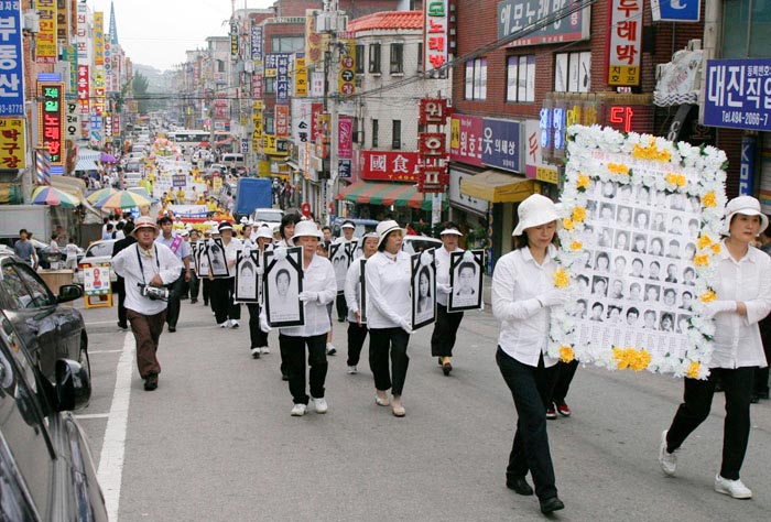 在游行队伍的后面,学员们举着部分被迫害致死的法轮功学员的照片缓缓前行,伴着低沉、悲壮的音乐,真人酷刑演示再次展现在市民面前,很多韩国市民按捺不住激愤的心情,纷纷踊跃接受记者采访,然而,当记者把镜头对向一位中国人时,他无奈的告诉记者:“对不起,我知道法轮大法好,要不怎么会有那么多外国人炼呢?但我不敢接受采访,我知道江××什么事都能干出来,我怕回国后遭到他们报复。”这就是江氏流氓集团在中国人民心中的真实写照。