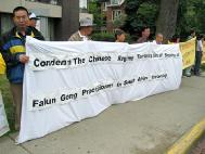 2004年7月1日中午,部分美国华盛顿DC法轮功学员在南非驻美大使馆前强烈谴责江氏流氓集团在南非雇凶杀人的恐怖主义行径,同时呼吁南非警方深入调查于6月28日晚在约翰内斯堡发生的法轮功学员遭黑枪射击案。