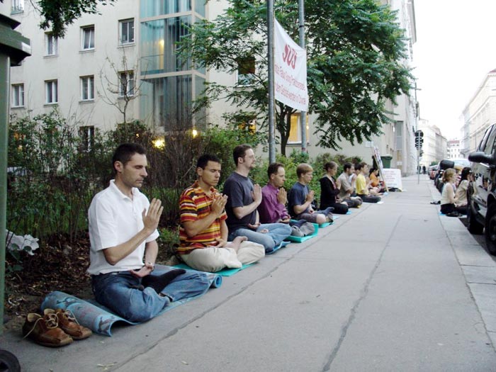 柏林法轮功学员于2004年6月29日下午在中国驻柏林大使馆举行新闻发布会,揭露江氏流氓集团不择手段的迫害海外法轮功学员的暴 行,呼吁各国政府、媒体、一切善良的人士,谴责江氏集团雇凶杀人的恐怖主义行径。