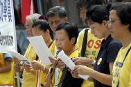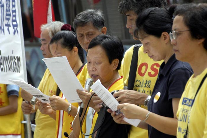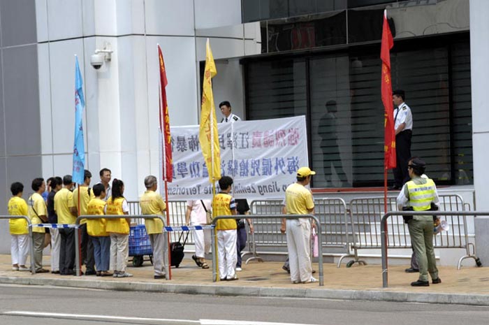 【明慧网2004年7月2日】6月30日上午,数十名香港法轮功学员在中联办外静坐并召开新闻发布会,强烈抗议及谴责江罗集团在南非炮制针对法轮功学员的恐怖枪击暴行。学员并且去到中联办门前宣读严正声明,指出这次事件是江氏集团实行国家恐怖主义,参与恐怖份子活动,采用黑社会手法灭绝人类信仰良知的大曝光,必将遭到全世界爱好和平的正义国家和民众的强烈谴责;并且促请南非政府撤查这次事件的真相,缉拿凶手,抵制江罗集团的黑手向海外延伸;更要求中国当局立即制止江罗集团这种严重败坏国家声誉的野蛮恐怖行为,停止对法轮功的种种形式的,并将犯罪份子绳之以法。