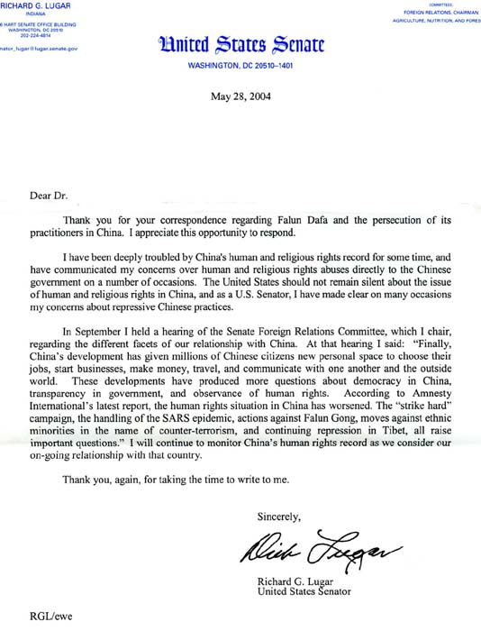 【明慧网2004年7月2日】美国参议员理查德- 卢格(Richard Lugar)5月28日复信给法轮功学员,感谢学员来函告知法轮大法的讯息及其在中国受迫害一事,并对中国的镇压行为表示关切。