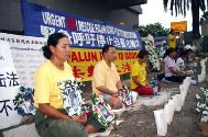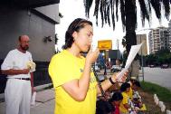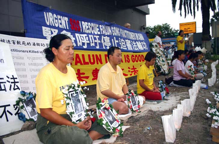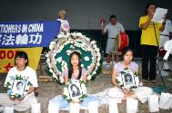 法轮功学员在草地上静静的坐着,默默悼念在江氏集团迫害下致死的同修。一位学员宣读了“致媒体公开信”,其中说道:“江氏集团对法轮功的迫害,完全是建立在谎言之上,从1999年7月20日开始,江氏集团动用国家全部宣传机器,二十四小时连续性的对法轮功造谣诬蔑、抛出一连串的谎言,编导一个个诬陷的事件,向民众散布仇恨。例如:‘天安门“自焚”案’,从中央电视台播放的慢镜头中可以看出,是经过精心策划、编导的一场骗局。江氏集团也将仇恨输向海外,江氏集团每次出访,将谎言的册子在海外散发,甚至在海外‘买凶谋杀’。江氏集团还集古今中外酷刑之大全,对法轮功学员進行惨无人道的迫害,至今为止,被迫害致死的已有1006位法轮功学员,遭受酷刑的无以计数……”学员念着被迫害致死的一个个法轮功学员名单,每位法轮功学员都有一个遭受迫害的经历,这就是江氏集团犯下滔天罪行的证据。
