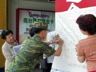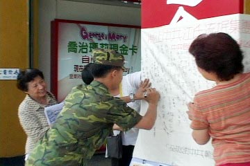 在菜市场征签的学员,他们无私无我奉献的精神,感动了菜贩,主动挪出空位给他们摆放法轮功真象展板。