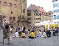 由于这个城市的法轮功学员定期到市中心去炼功,发资料并配合办咨询日活动,人们很熟悉他们。很多人高兴的走过来告诉学员:我已经看过你们的资料了,有新资料吗,在哪可以炼功?还有人和学员一聊就是一个多小时不愿离开。尤其是当女士们和小孩们接到印有“法轮大法好”的书签和明信片时,如同得到心爱的礼物一样高兴和感激。有一位漂亮的德国小女孩见学员打坐,她也要炼,一坐就很长时间,一动不动,等大家结束了她仍然十分入静的继续打坐,旁人很难相信她是第一次炼功,大家都为这位有缘份的女孩高兴。