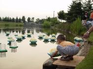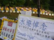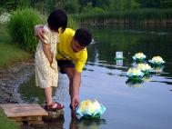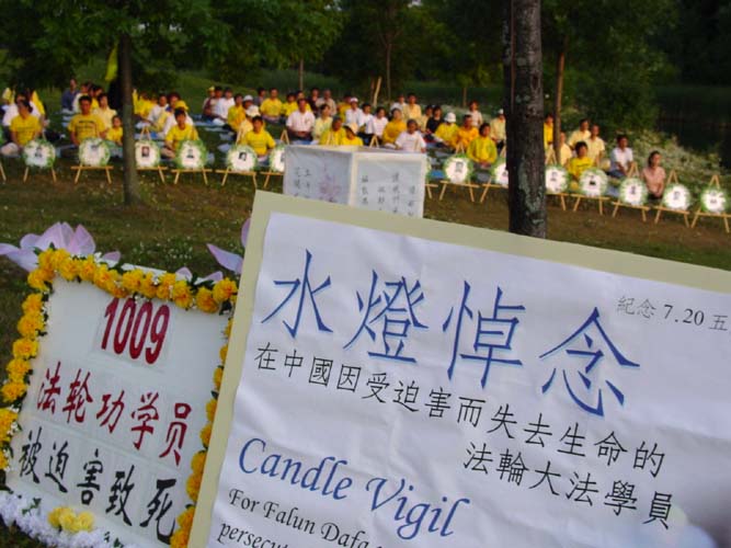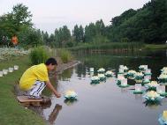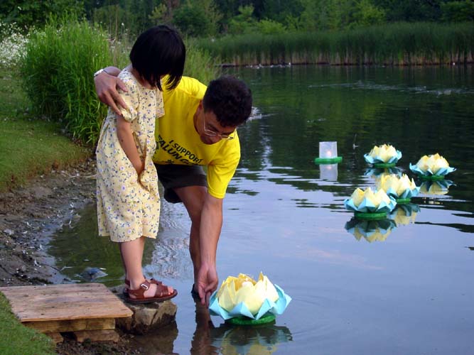 【明慧网2004年7月21日】2004年7月19日的傍晚,凉风轻袭,多伦多的部分法轮功学员在美丽根公园的湖边静静的放下一盏盏亲手制作的莲灯,是时斜阳欲坠,柳叶微摇,。仿佛天地间都在为那1009名为了真理而被迫害致死的高贵的大法弟子深沉的叹息,缕缕轻风拂过,湖面水波荡漾,仿佛在默默的诉说着他(她)们在强权和暴力下坚持正信、救度众生的一个个荡气回肠的故事。
