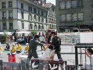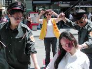 这是瑞士学员第一次举办酷刑展活动。为使这次活动获得圆满成功,部分学员克服困难,夜以继日,精心進行准备,在很短的时间内,完成了服装、道具等的制作。为使化妆收到满意的效果,负责化妆的学员专门走访了伯尔尼大剧院的专业化妆师。在了解了法轮功受迫害的真象及这次“酷刑展”的意义后,那位化妆师十分受感动,除按优惠价格出售化妆品外,又免费赠送了一部分,并祝愿活动成功。参加这次“酷刑展”的学员既有20几岁的年轻大学生,又有年近70岁的老年学员,其中有三对学员夫妇,特别是一位两个月前刚刚生过孩子的年轻母亲,把正在哺乳期的孩子托给别人看管,和丈夫一起参加了一整天的酷刑展活动。