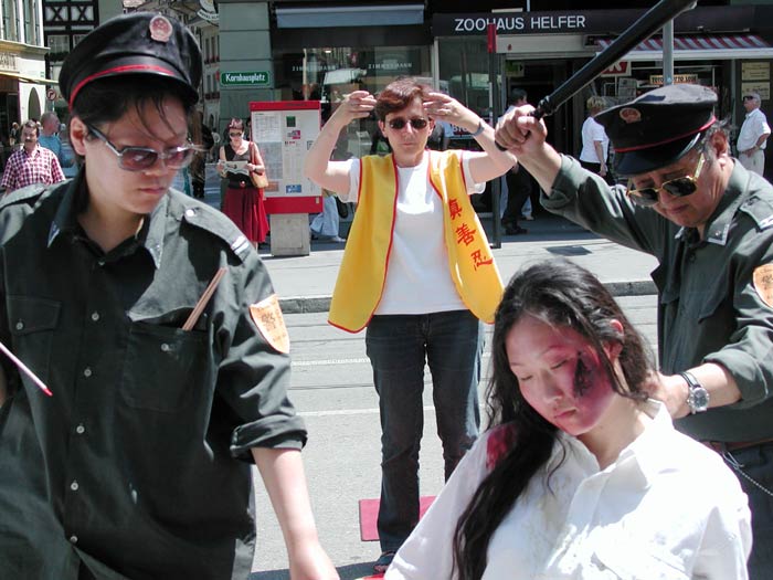参加表演的学员在前一天晚上即到达伯尔尼,他们认真排练至深夜近两点。当天早上五点多就起床、化妆,做各种准备。上午11点多,当“被酷刑折磨得遍体鳞伤”的学员在“恶警”的挟持下出现在现场时,不少在场的学员都流下了眼泪,他们逼真的表演感动了所有人。
