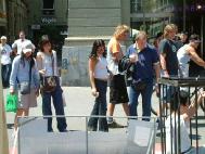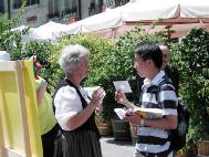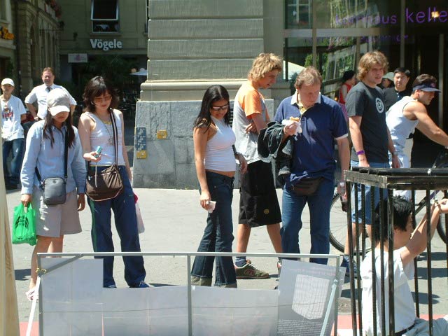 许多过路人被眼前的情景震惊了,他们表情凝重的观看着,有的妇女眼中饱含热泪,他们纷纷向学员了解法轮功的真象。一位善良的中年妇女抽咽着问:“他们在中国真的被折磨得这么厉害吗?”学员回答说,在中国的法轮功学员所经受的酷刑折磨比这要残忍得多!她连连摇头说“太残暴了!太残暴了!”一位曾到过中国访问的瑞士音乐家说,他强忍着眼泪看了学员们的表演,感到心头受到震颤。他一再表达了对法轮功学员维护人权行动的理解和支持,并表示坚信正义会战胜邪恶,光明就在眼前。在旁边的露天咖啡店,他坐在那里观看着,久久不肯离去。从西班牙来的一队年轻学生,在老师的带领下路过这里,可能因为时间的缘故,老师催促大家离开,尽管许多学生不愿走。到了下午,有两个学生利用休息时间,特意从别处跑来,他们说上午看到酷刑展感到非常震惊,留下了深刻的印象,他们向学员索要真象材料,表示非常想了解法轮功及其在中国被镇压的情况。