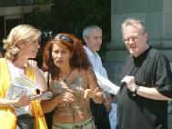 一位扮演酷刑受害者的女法轮功学员在接受记者采访时表示:我们今天来这里的目地是告诉大家,每天在中国发生着什么样的事情。但我们今天所演的不及真实情况的万分之一。法轮功学员只是想按照“真善忍”的原则做个好人,可是他们却在中国大陆受到这么惨无人道的迫害。现在是该结束的时候了!当世界上所有的人都了解法轮功真象的时候,这一切就该结束了。这也正是我们今天来这里这样做的目地。