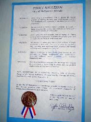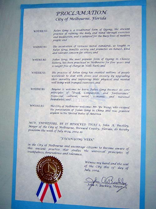 鉴此,我,约翰-巴克利(John A. Buckley),佛罗里达州布瑞维德县(Brevard County)墨尔本市的市长,在此宣布,2004年7月18日至24日为我市的“法轮功周”,并鼓励市民了解这一古老的探寻宇宙特性真善忍的功法。