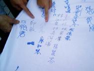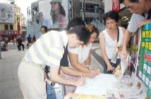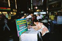 一位七十多岁的老先生,法轮功学员告诉他,1999年6月10日,江泽民避开了中国宪法和正常的法律程序,直接命令中央成立了一个专职镇压法轮功的机构──处理法轮功问题办公室,因成立日期,又被简称为“610办公室”,有系统性的对数以千万计坚持信仰“真善忍”的中国法轮功学员实行“名誉上搞臭、经济上截断、肉体上消灭”,“打死白死、打死算自杀”,“不查身源、直接火化”的灭绝政策。五年来通过民间途径,能够传出消息的已有上千名法轮功学员被迫害致死。老先生听完后表示,他不会写字但是很想签名,并请学员握他的手把名字写上去。他说“制止迫害这种事情,要越多人来做越有力量。”