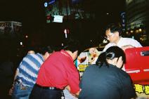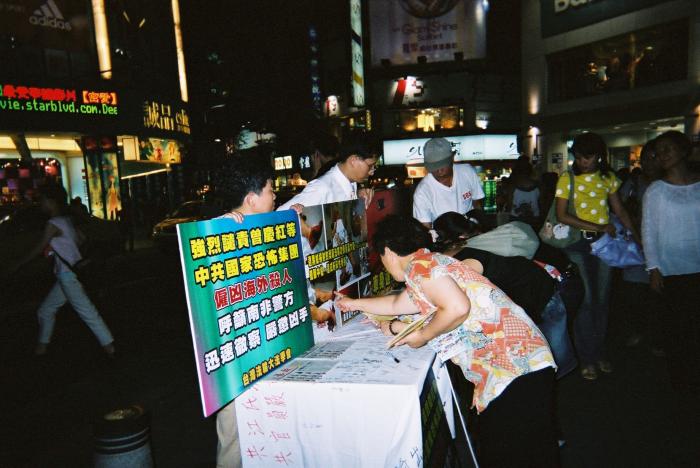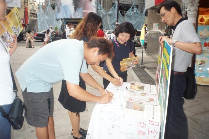2004年7月11日在台北仁爱路,法轮功学员举着签名布条,向群众诉说着江氏流氓集团的党羽副主席曾庆红及与薄熙来于6月27日至29日在南非访问期间,前往请愿的法轮功学员于6月28日晚上遭到了黑枪袭击,至少有5枪击中车辆。开车的David Liang两脚中枪,一脚粉碎性骨折。法轮功学员希望能唤起民众共同制止这恐怖暴行之际,分别遇到二位立法委员邱毅与陈文茜,他们明白真象后,签下名字表达了他们的正义之声。