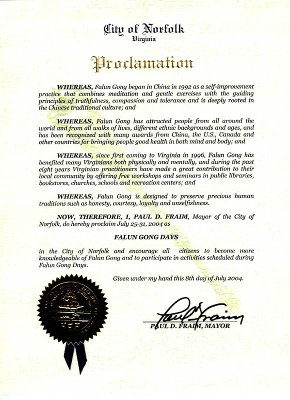 因此,我,诺福克市(Norfolk)市长保罗-福拉姆,在此宣布2004年7月25至31日为诺福克市“法轮功日”,并鼓励全体市民更深入的了解法轮功,并参加“法轮功日”的活动。