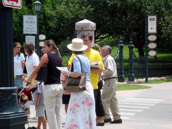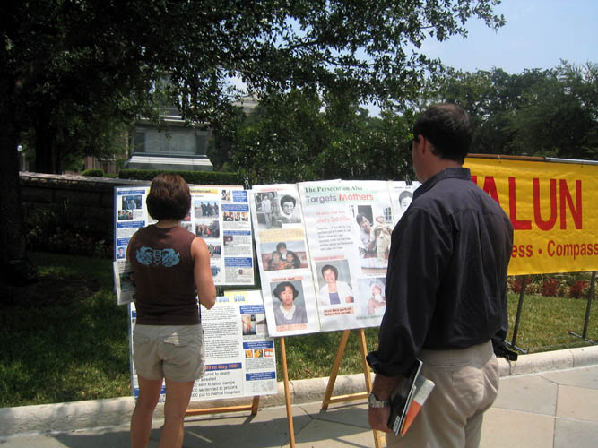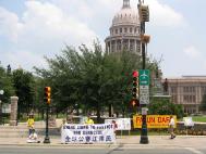引人瞩目的--“法轮大法 真-善-忍”;“审判群体灭绝罪犯江泽民”的大横幅在华氏大约100度的德州烈日下,醒目鲜艳,传递著强烈的信息--自1999年7月20日至今,这场持续了五年之久,灭绝人性的迫害必须停止!迫害法轮功的罪人江泽民必须受到审判。