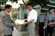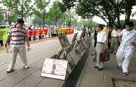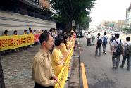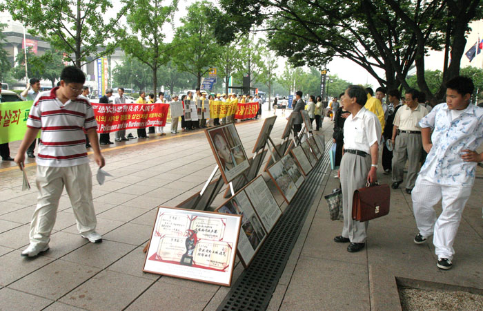 学员们肃穆地朗读了对被迫害致死的法轮功学员的悼词,之后又对法轮大法及5年来的镇压过程作了详细说明。其间连警察们都关心的仔细聆听。“声明书”由韩国和华人学员分别用韩文及中文進行朗读,扬声器把这坚定的声音传到了对面的中国大使馆。在记者招待会上,记者们详细采访了就法轮大法遭受镇压5年之际,韩国大法学会的立场及大法在中国遭受迫害的实际情况。